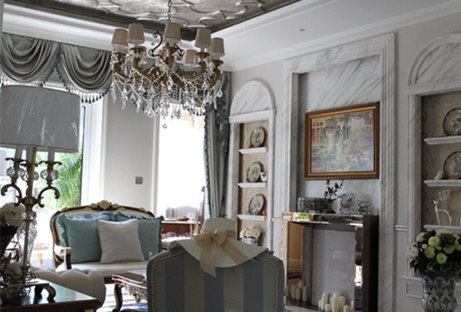 玄关过廊尽头的马赛克和面面相觑的天鹅,客厅的银色沙发,茶几上的蓝色妖姬,餐厅的烛台,昂贵的香槟,增加了空间的法式情调。